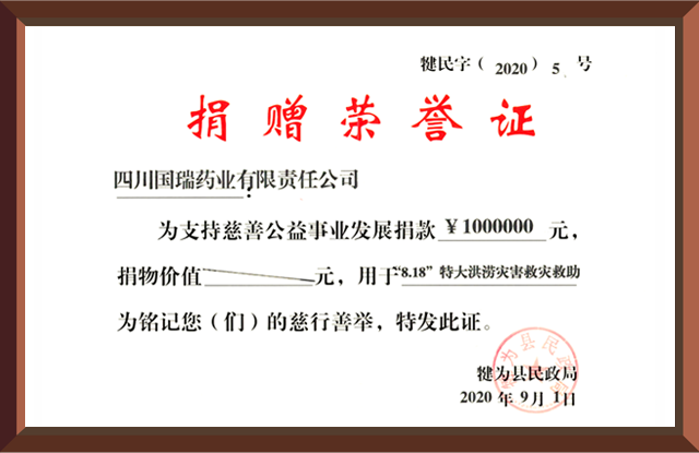 2020年8月18日,四川省犍为县遭遇百年未遇特大洪涝灾害,MK体育·「中国」官方网站-MK SPORTS集团国瑞药业向犍为县灾区捐赠现金100万元。